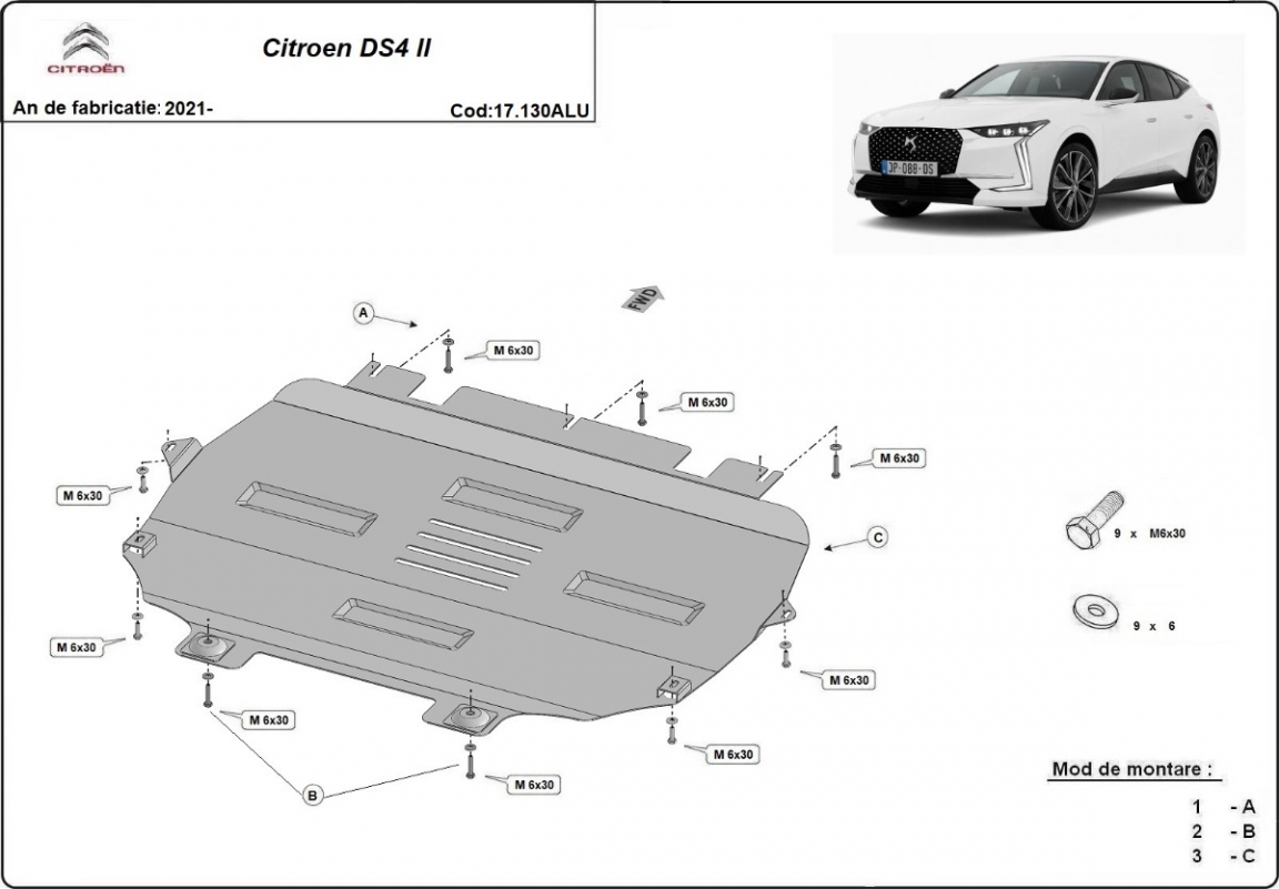 Skid plate for the protection of the: engine, gearbox, radiator, front bumper . The skid plate is new and fits perfectly for all versions of Citroen DS4 II manufactured between 2021 and 2026. Made out of 3 mm thick Aluminium plate. The shields are made of aluminum, but the mounting brackets are made of steel. Screws, nuts, clips, all fastening accessories are included. All skid plates are powder coated to prevent corrosion. The exterior of the skid plate is provided with Aluminium reinforcements, which increases the resistance to impact. |