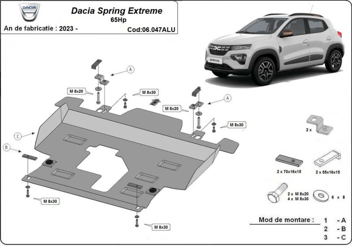 Skid plate for the protection of the: engine, gearbox, radiator . The skid plate is new and fits perfectly for all versions of Dacia Spring manufactured between 2023 and 2026. Made out of 4 mm thick Aluminium plate. The shields are made of aluminum, but the mounting brackets are made of steel. Screws, nuts, clips, all fastening accessories are included. All skid plates are powder coated to prevent corrosion. The exterior of the skid plate is provided with Aluminium reinforcements, which increases the resistance to impact. |