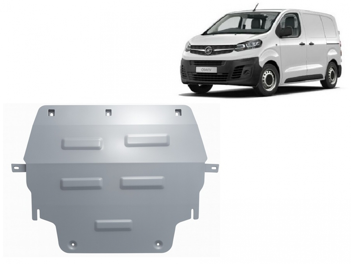 Skid plate for the protection of the: engine, gearbox, radiator . The skid plate is new and fits perfectly for all versions of Opel Vivaro manufactured between 2019 and 2026. Made out of 3 mm thick Aluminium plate. The shields are made of aluminum, but the mounting brackets are made of steel. Screws, nuts, clips, all fastening accessories are included. All skid plates are powder coated to prevent corrosion. The exterior of the skid plate is provided with Aluminium reinforcements, which increases the resistance to impact. |