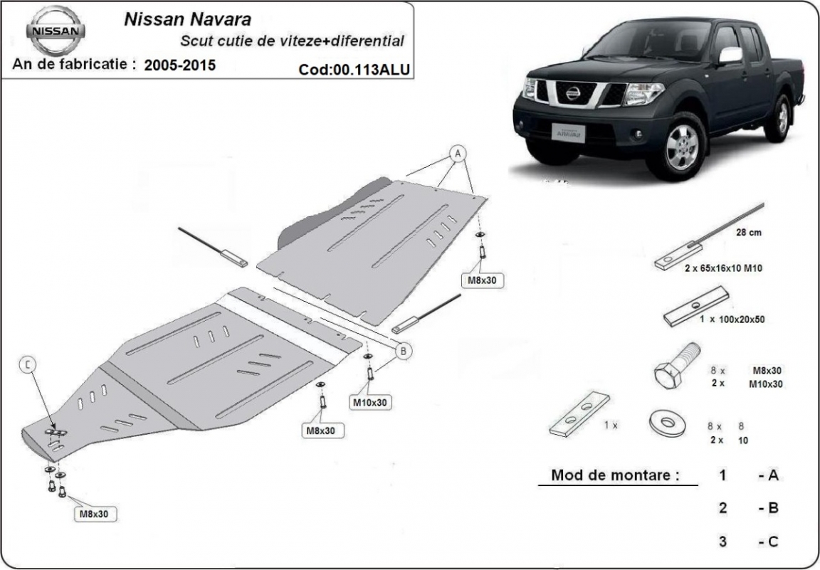 Skid plate for the protection of the: gearbox, Transfer case . The skid plate is new and fits perfectly for all versions of Nissan Navara manufactured between 2005 and 2015. Made out of 4 mm thick Aluminium plate. The shields are made of aluminum, but the mounting brackets are made of steel. Screws, nuts, clips, all fastening accessories are included. All skid plates are powder coated to prevent corrosion. The exterior of the skid plate is provided with Aluminium reinforcements, which increases the resistance to impact. |