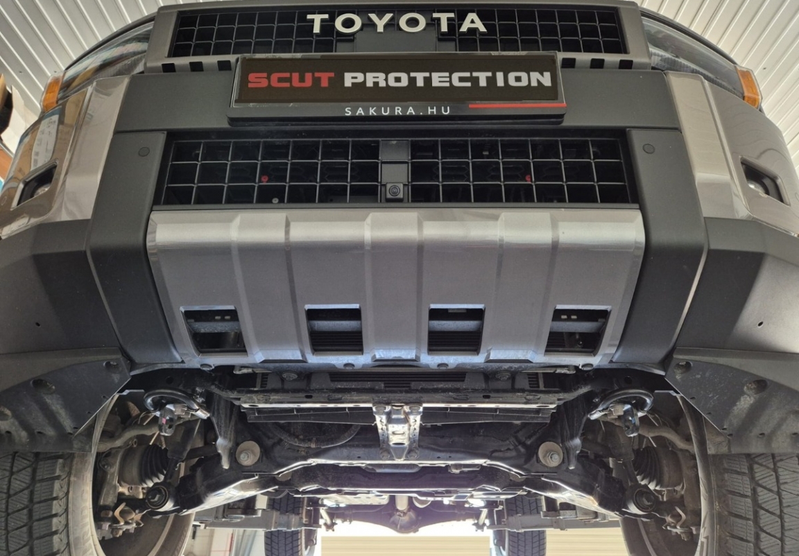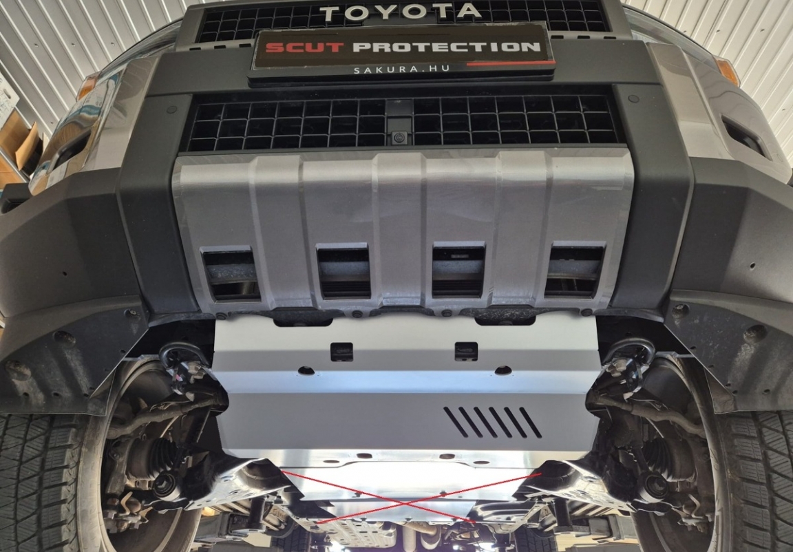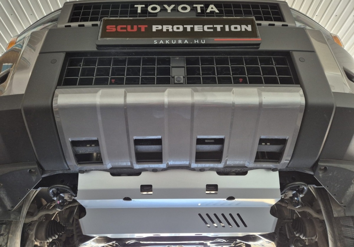 Skid plate for the protection of the: radiator . The skid plate is new and fits perfectly for the Toyota Land Cruiser 250, with the following engine/drive versions: Toate - manufactured between 2024 and 2026. Made out of 4 mm thick Aluminium plate. The shields are made of aluminum, but the mounting brackets are made of steel. Screws, nuts, clips, all fastening accessories are included. All skid plates are powder coated to prevent corrosion. The exterior of the skid plate is provided with Aluminium reinforcements, which increases the resistance to impact. |