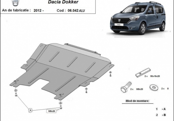 Skid plate for the protection of the: engine, gearbox . The skid plate is new and fits perfectly for all versions of Dacia Dokker manufactured between 2012 and 2020. Made out of 4 mm thick Aluminium plate. The shields are made of aluminum, but the mounting brackets are made of steel. Screws, nuts, clips, all fastening accessories are included. All skid plates are powder coated to prevent corrosion. The exterior of the skid plate is provided with Aluminium reinforcements, which increases the resistance to impact. |