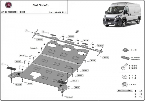 Skid plate for the protection of the: engine, gearbox, radiator . The skid plate is new and fits perfectly for all versions of Fiat Ducato manufactured between 2016 and 2026. Made out of 4 mm thick Aluminium plate. The shields are made of aluminum, but the mounting brackets are made of steel. Screws, nuts, clips, all fastening accessories are included. All skid plates are powder coated to prevent corrosion. The exterior of the skid plate is provided with Aluminium reinforcements, which increases the resistance to impact. |