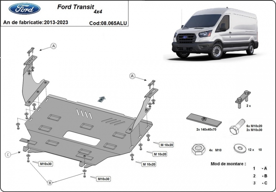 Skid plate for the protection of the: engine, gearbox . The skid plate is new and fits perfectly for all versions of Ford Transit 4x4 manufactured between 2013 and 2023. Made out of 3 mm thick Aluminium plate. The shields are made of aluminum, but the mounting brackets are made of steel. Screws, nuts, clips, all fastening accessories are included. All skid plates are powder coated to prevent corrosion. The exterior of the skid plate is provided with Aluminium reinforcements, which increases the resistance to impact. |
