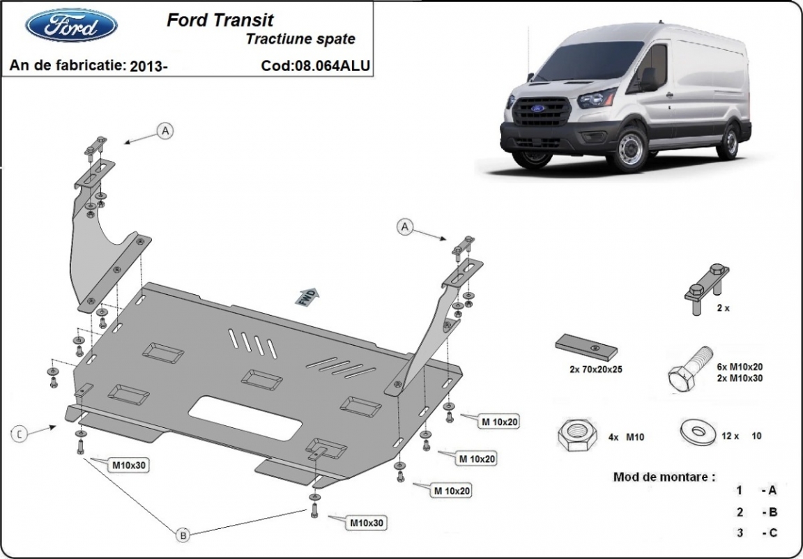 Skid plate for the protection of the: engine, gearbox . The skid plate is new and fits perfectly for all versions of Ford Transit manufactured between 2013 and 2026. Made out of 3 mm thick Aluminium plate. The shields are made of aluminum, but the mounting brackets are made of steel. Screws, nuts, clips, all fastening accessories are included. All skid plates are powder coated to prevent corrosion. The exterior of the skid plate is provided with Aluminium reinforcements, which increases the resistance to impact. |