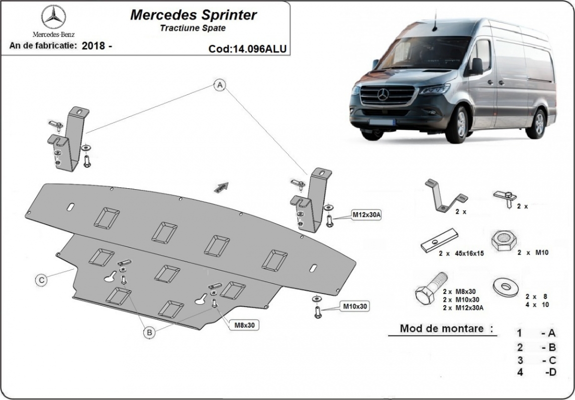 Skid plate for the protection of the: engine, radiator, front bumper . The skid plate is new and fits perfectly for all versions of Mercedes Sprinter - RWD manufactured between 2018 and 2026. Made out of 3 mm thick Aluminium plate. The shields are made of aluminum, but the mounting brackets are made of steel. Screws, nuts, clips, all fastening accessories are included. All skid plates are powder coated to prevent corrosion. The exterior of the skid plate is provided with Aluminium reinforcements, which increases the resistance to impact. |
