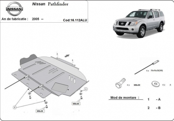 Skid plate for the protection of the: engine . The skid plate is new and fits perfectly for all versions of Nissan Pathfinder manufactured between 2005 and 2026. Made out of 4 mm thick Aluminium plate. The shields are made of aluminum, but the mounting brackets are made of steel. Screws, nuts, clips, all fastening accessories are included. All skid plates are powder coated to prevent corrosion. The exterior of the skid plate is provided with Aluminium reinforcements, which increases the resistance to impact. |