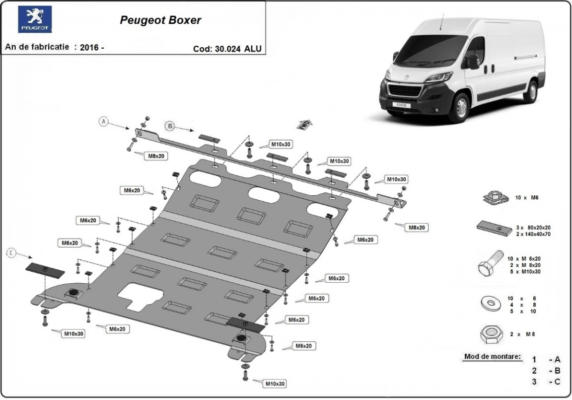 Skid plate for the protection of the: engine, gearbox, radiator . The skid plate is new and fits perfectly for all versions of Peugeot Boxer manufactured between 2016 and 2026. Made out of 4 mm thick Aluminium plate. The shields are made of aluminum, but the mounting brackets are made of steel. Screws, nuts, clips, all fastening accessories are included. All skid plates are powder coated to prevent corrosion. The exterior of the skid plate is provided with Aluminium reinforcements, which increases the resistance to impact. |