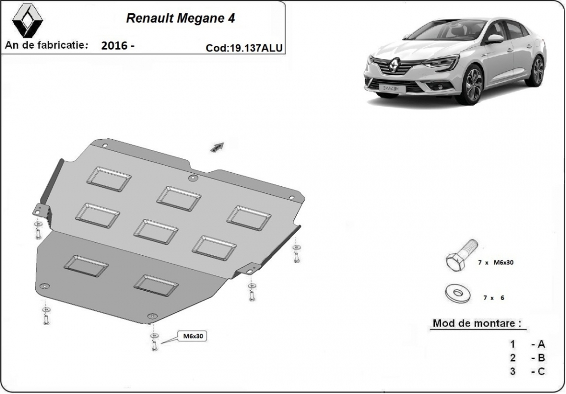 Skid plate for the protection of the: engine, gearbox . The skid plate is new and fits perfectly for all versions of Renault Megane IV manufactured between 2016 and 2026. Made out of 3 mm thick Aluminium plate. The shields are made of aluminum, but the mounting brackets are made of steel. Screws, nuts, clips, all fastening accessories are included. All skid plates are powder coated to prevent corrosion. The exterior of the skid plate is provided with Aluminium reinforcements, which increases the resistance to impact. |