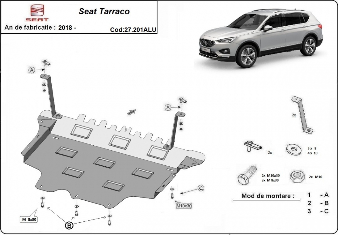 Skid plate for the protection of the: engine, gearbox, radiator, front bumper . The skid plate is new and fits perfectly for all versions of Seat Tarraco manufactured between 2018 and 2026. Made out of 3 mm thick Aluminium plate. The shields are made of aluminum, but the mounting brackets are made of steel. Screws, nuts, clips, all fastening accessories are included. All skid plates are powder coated to prevent corrosion. The exterior of the skid plate is provided with Aluminium reinforcements, which increases the resistance to impact. |