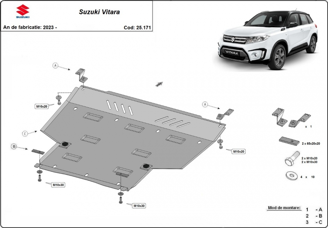 Skid plate for the protection of the: engine, gearbox . The skid plate is new and fits perfectly for the Suzuki Vitara, with the following engine/drive versions: Hybrid - manufactured between 2023 and 2026. Made out of 4 mm thick Aluminium plate. The shields are made of aluminum, but the mounting brackets are made of steel. Screws, nuts, clips, all fastening accessories are included. All skid plates are powder coated to prevent corrosion. The exterior of the skid plate is provided with Aluminium reinforcements, which increases the resistance to impact. |