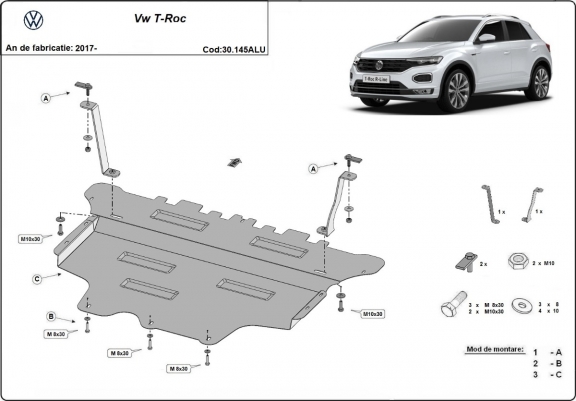 Skid plate for the protection of the: engine, gearbox, radiator, front bumper . The skid plate is new and fits perfectly for all versions of Volkswagen T-Roc manufactured between 2017 and 2026. Made out of 3 mm thick Aluminium plate. The shields are made of aluminum, but the mounting brackets are made of steel. Screws, nuts, clips, all fastening accessories are included. All skid plates are powder coated to prevent corrosion. The exterior of the skid plate is provided with Aluminium reinforcements, which increases the resistance to impact. |