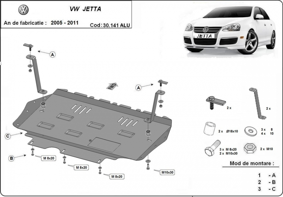 Skid plate for the protection of the: engine, gearbox, radiator . The skid plate is new and fits perfectly for all versions of VW Jetta manufactured between 2005 and 2011. Made out of 3 mm thick Aluminium plate. The shields are made of aluminum, but the mounting brackets are made of steel. Screws, nuts, clips, all fastening accessories are included. All skid plates are powder coated to prevent corrosion. The exterior of the skid plate is provided with Aluminium reinforcements, which increases the resistance to impact. |