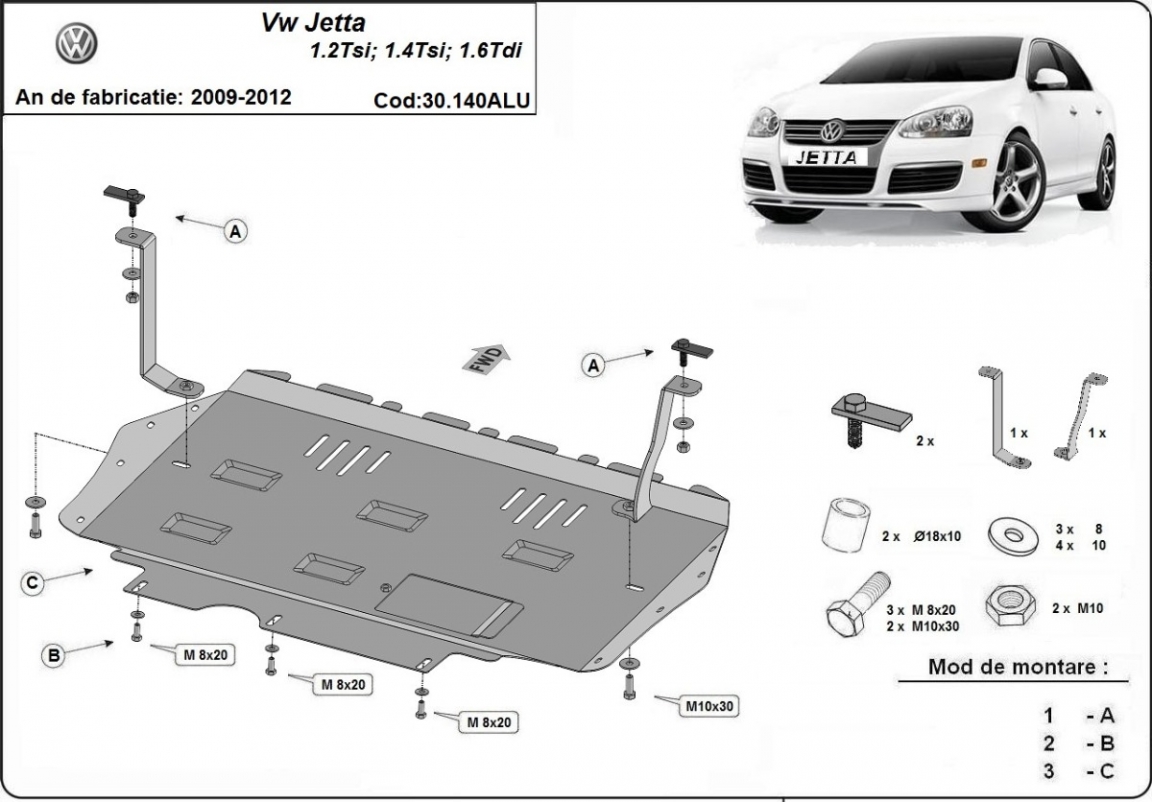 Skid plate for the protection of the: engine, gearbox, radiator . The skid plate is new and fits perfectly for the VW Jetta, with the following engine/drive versions: 1.2Tsi, 1.4Tsi, 1.6Tdi - manufactured between 2009 and 2012. Made out of 3 mm thick Aluminium plate. The shields are made of aluminum, but the mounting brackets are made of steel. Screws, nuts, clips, all fastening accessories are included. All skid plates are powder coated to prevent corrosion. The exterior of the skid plate is provided with Aluminium reinforcements, which increases the resistance to impact. |