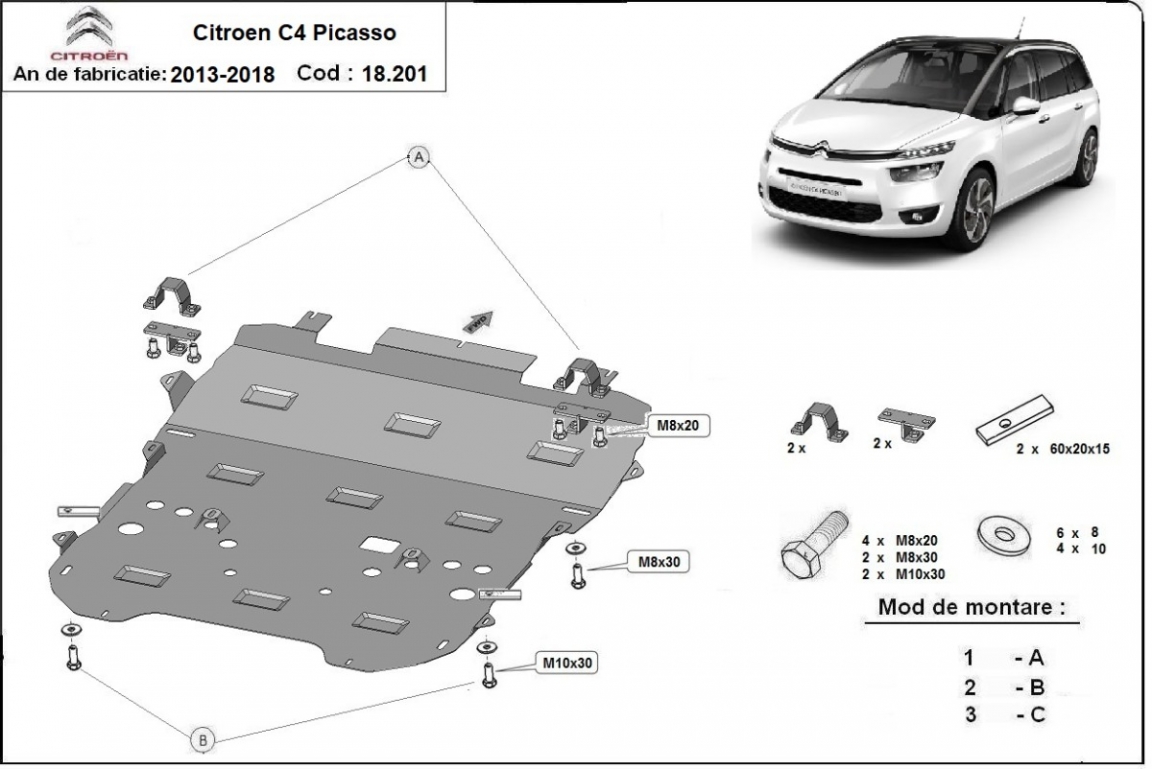 Skid plate for the protection of the: engine, gearbox, radiator, front bumper . The skid plate is new and fits perfectly for all versions of Citroen C4 Picasso manufactured between 2013 and 2018. Made out of 2 mm thick Steel plate. Screws, nuts, clips, all fastening accessories are included. All skid plates are powder coated to prevent corrosion. The exterior of the skid plate is provided with Steel reinforcements, which increases the resistance to impact. |