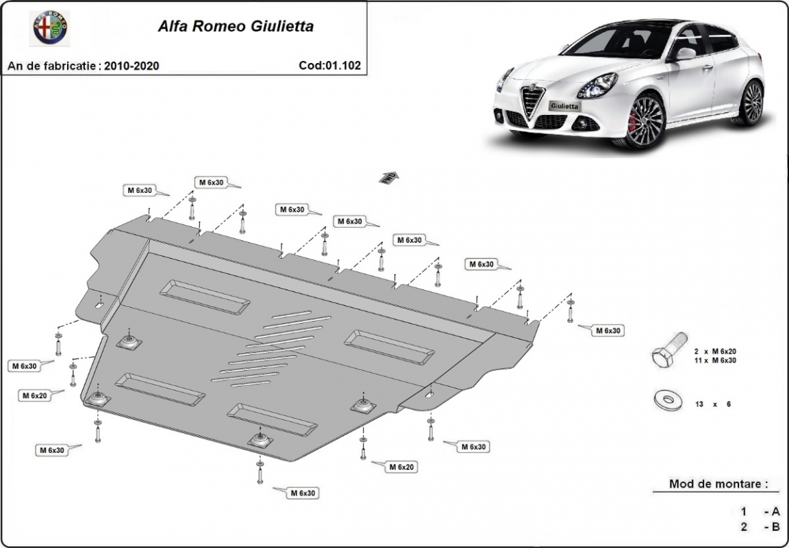 Skid plate for the protection of the: engine, gearbox, radiator . The skid plate is new and fits perfectly for all versions of Alfa Romeo Giulietta manufactured between 2010 and 2020. Made out of 2 mm thick Steel plate. Screws, nuts, clips, all fastening accessories are included. All skid plates are powder coated to prevent corrosion. The exterior of the skid plate is provided with Steel reinforcements, which increases the resistance to impact. |