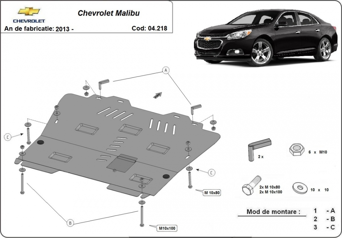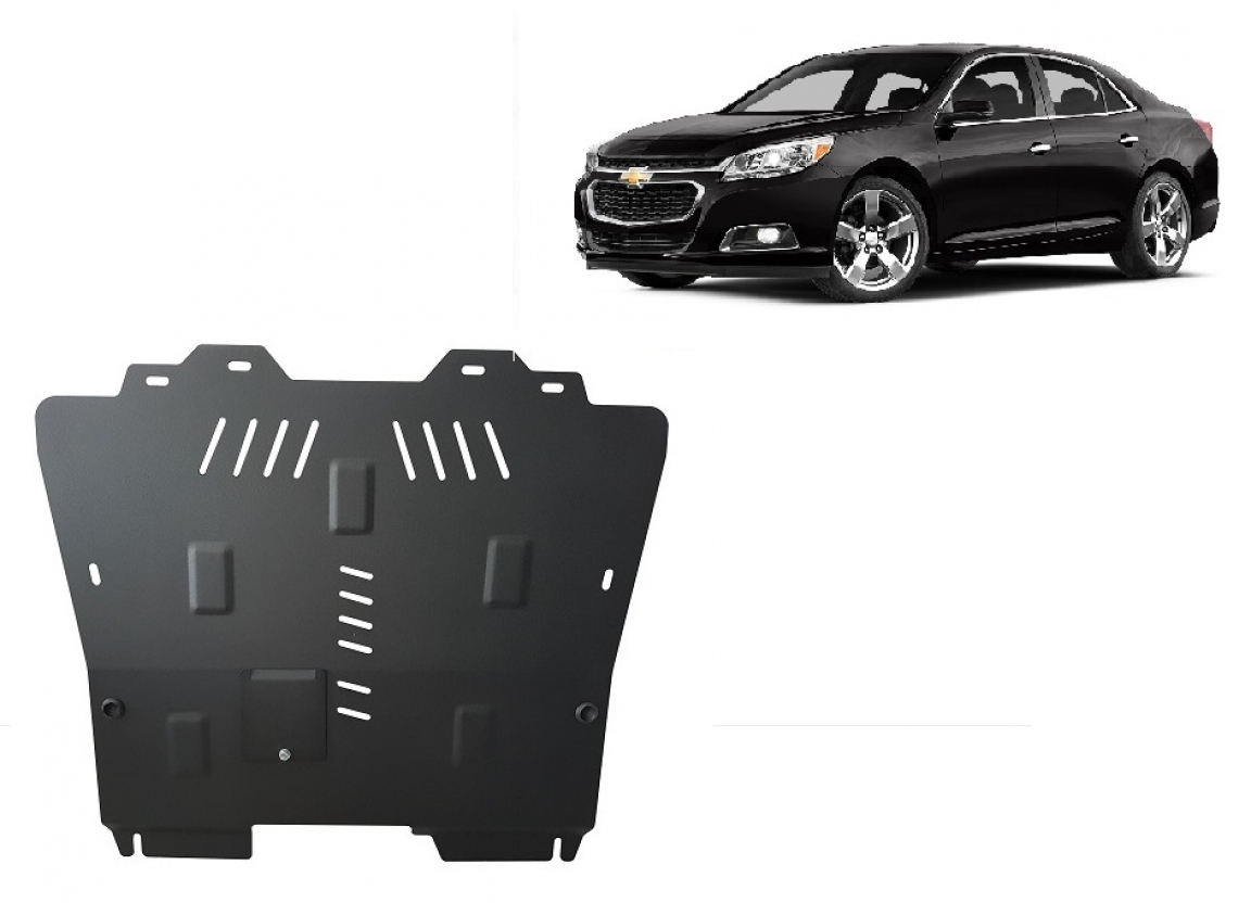Skid plate for the protection of the: engine, gearbox, radiator . The skid plate is new and fits perfectly for all versions of Chevrolet Malibu manufactured between 2013 and 2015. It has an opening for the oil sump, so it's removal won't be necessary to change the oil. Made out of 2 mm thick Steel plate. Screws, nuts, clips, all fastening accessories are included. All skid plates are powder coated to prevent corrosion. The exterior of the skid plate is provided with Steel reinforcements, which increases the resistance to impact. |