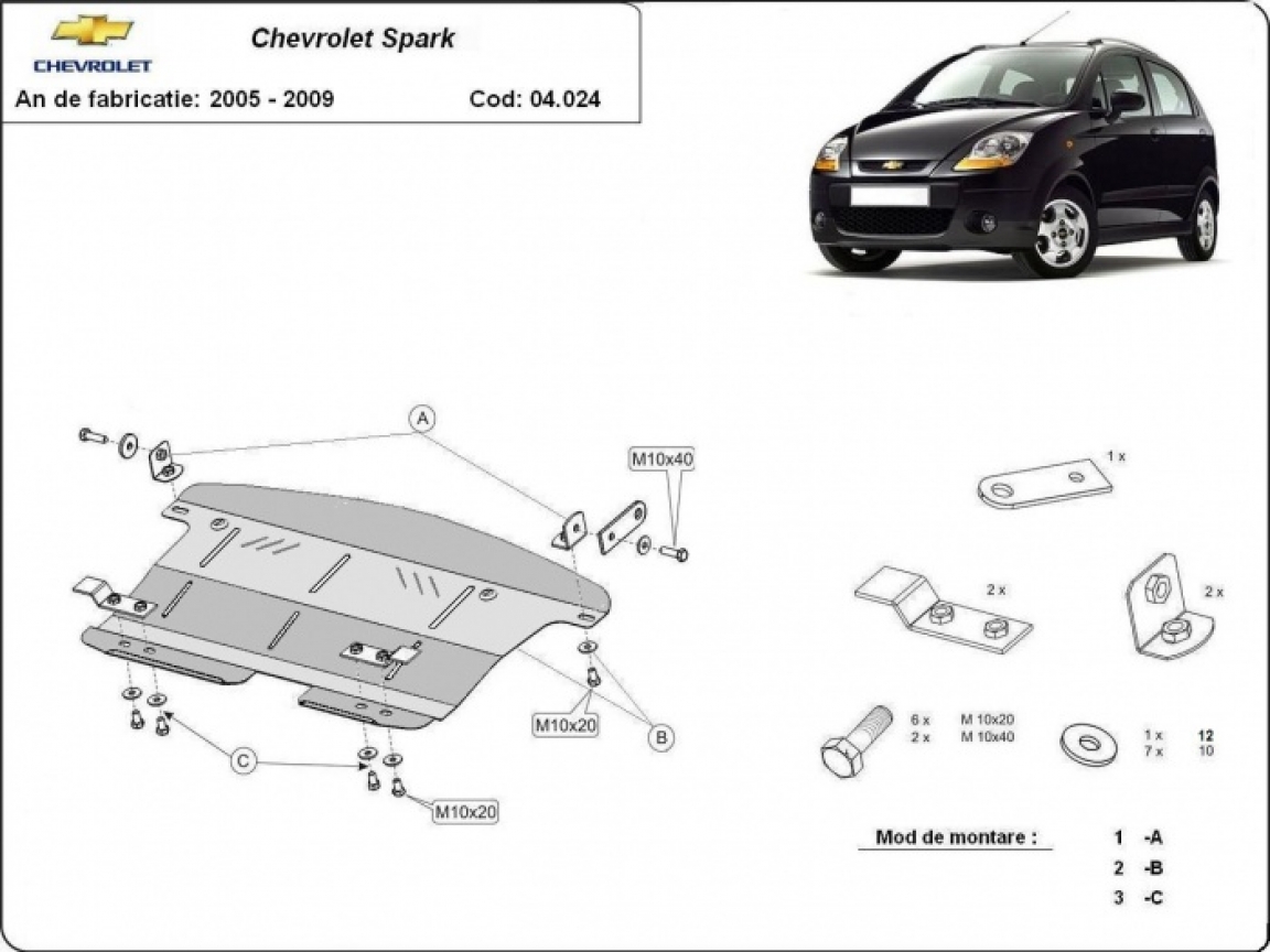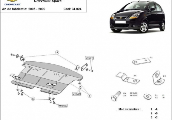 Skid plate for the protection of the: engine, gearbox, radiator . The skid plate is new and fits perfectly for all versions of Chevrolet Spark manufactured between 2005 and 2009. Made out of 2 mm thick Steel plate. Screws, nuts, clips, all fastening accessories are included. All skid plates are powder coated to prevent corrosion. The exterior of the skid plate is provided with Steel reinforcements, which increases the resistance to impact. |