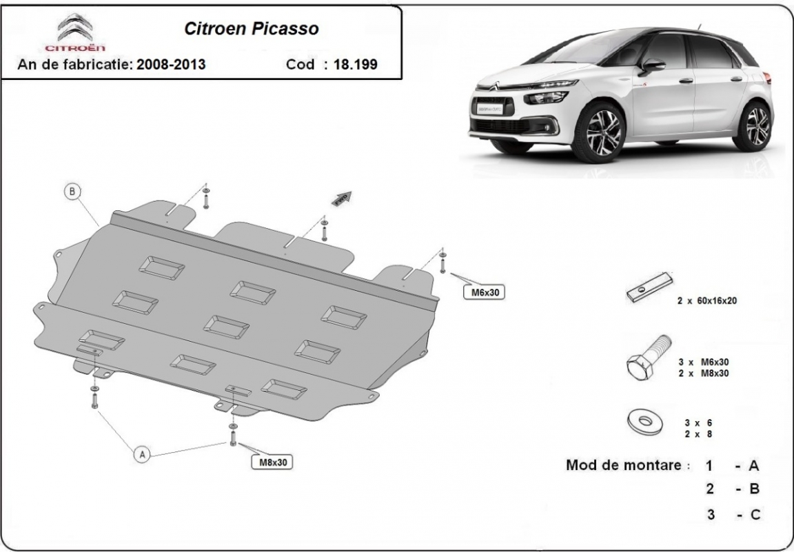 Skid plate for the protection of the: engine, gearbox, radiator . The skid plate is new and fits perfectly for all versions of Citroen C4 Picasso manufactured between 2008 and 2013. Made out of 2 mm thick Steel plate. Screws, nuts, clips, all fastening accessories are included. All skid plates are powder coated to prevent corrosion. The exterior of the skid plate is provided with Steel reinforcements, which increases the resistance to impact. |