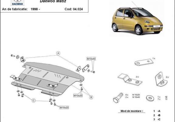 Skid plate for the protection of the: engine, gearbox . The skid plate is new and fits perfectly for all versions of Daewoo Matiz manufactured between 1998 and 2004. Made out of 2 mm thick Steel plate. Screws, nuts, clips, all fastening accessories are included. All skid plates are powder coated to prevent corrosion. The exterior of the skid plate is provided with Steel reinforcements, which increases the resistance to impact. |