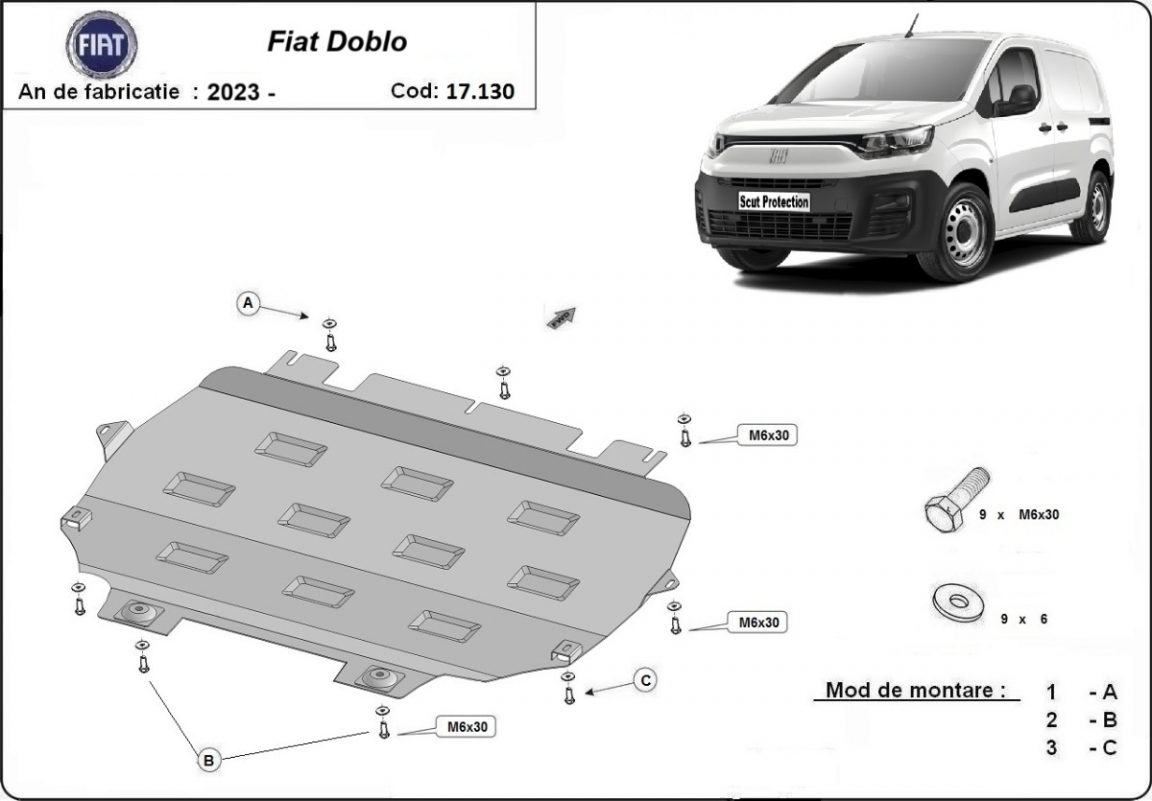 Skid plate for the protection of the: engine, gearbox, radiator . The skid plate is new and fits perfectly for all versions of Fiat Doblo manufactured between 2023 and 2026. Made out of 2 mm thick Steel plate. Screws, nuts, clips, all fastening accessories are included. All skid plates are powder coated to prevent corrosion. The exterior of the skid plate is provided with Steel reinforcements, which increases the resistance to impact. |