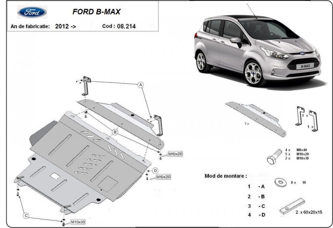 Skid plate for the protection of the: engine, gearbox, front bumper . The skid plate is new and fits perfectly for all versions of Ford B-Max manufactured between 2012 and 2017. It has an opening for the oil sump, so it's removal won't be necessary to change the oil. Made out of 2 mm thick Steel plate. Screws, nuts, clips, all fastening accessories are included. All skid plates are powder coated to prevent corrosion. The exterior of the skid plate is provided with Steel reinforcements, which increases the resistance to impact. |