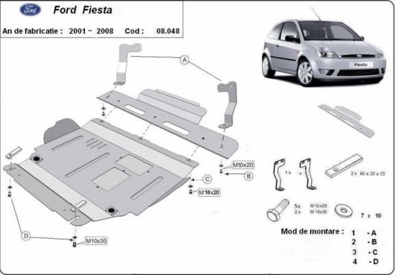 Skid plate for the protection of the: engine, gearbox, radiator, front bumper . The skid plate is new and fits perfectly for all versions of Ford Fiesta manufactured between 2001 and 2008. It has an opening for the oil sump, so it's removal won't be necessary to change the oil. Made out of 2 mm thick Steel plate. Screws, nuts, clips, all fastening accessories are included. All skid plates are powder coated to prevent corrosion. The exterior of the skid plate is provided with Steel reinforcements, which increases the resistance to impact. |