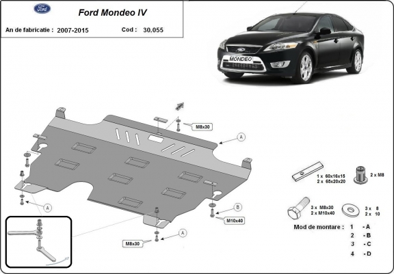 Skid plate for the protection of the: engine, gearbox, radiator . The skid plate is new and fits perfectly for all versions of Ford Mondeo 4 manufactured between 2007 and 2015. Made out of 2 mm thick Steel plate. Screws, nuts, clips, all fastening accessories are included. All skid plates are powder coated to prevent corrosion. The exterior of the skid plate is provided with Steel reinforcements, which increases the resistance to impact. |