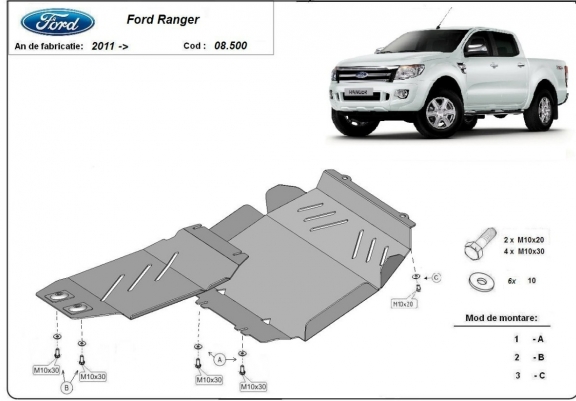 Skid plate for the protection of the: engine, front bumper . The skid plate is new and fits perfectly for all versions of Ford Ranger manufactured between 2010 and 2023. Made out of 3 mm thick Steel plate. Screws, nuts, clips, all fastening accessories are included. All skid plates are powder coated to prevent corrosion. The exterior of the skid plate is provided with Steel reinforcements, which increases the resistance to impact. |