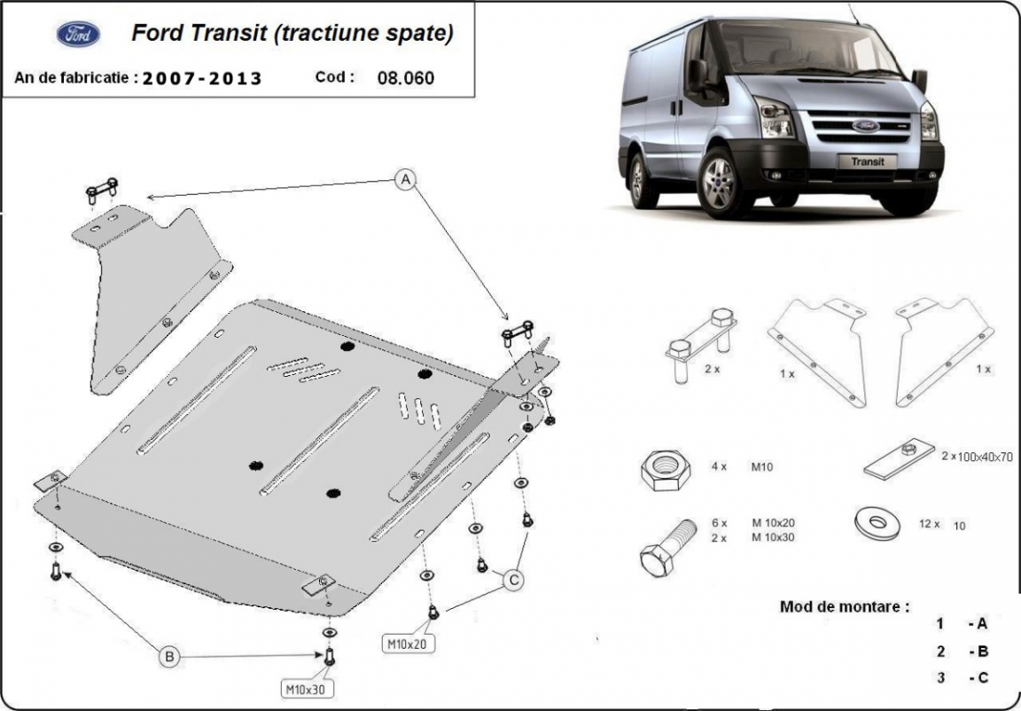 Skid plate for the protection of the: engine, gearbox, radiator, front bumper . The skid plate is new and fits perfectly for all versions of Ford Transit - RWD manufactured between 2007 and 2013. Made out of 2 mm thick Steel plate. Screws, nuts, clips, all fastening accessories are included. All skid plates are powder coated to prevent corrosion. The exterior of the skid plate is provided with Steel reinforcements, which increases the resistance to impact. |
