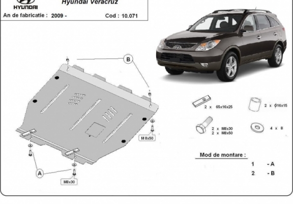 Skid plate for the protection of the: engine, gearbox . The skid plate is new and fits perfectly for all versions of Hyundai Veracruz manufactured between 2009 and 2015. It has an opening for the oil sump, so it's removal won't be necessary to change the oil. Made out of 3 mm thick Steel plate. Screws, nuts, clips, all fastening accessories are included. All skid plates are powder coated to prevent corrosion. The exterior of the skid plate is provided with Steel reinforcements, which increases the resistance to impact. |