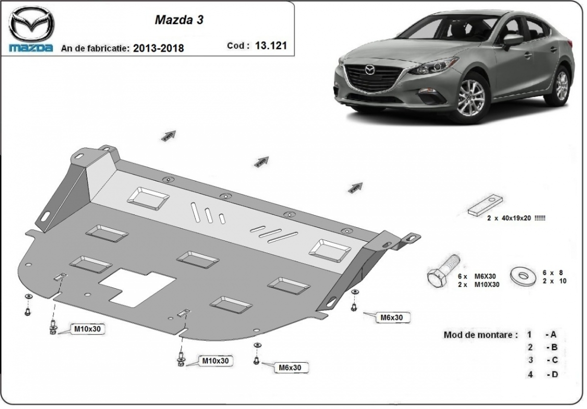 Skid plate for the protection of the: engine, gearbox, radiator . The skid plate is new and fits perfectly for all versions of Mazda 3 manufactured between 2013 and 2018. Made out of 2 mm thick Steel plate. Screws, nuts, clips, all fastening accessories are included. All skid plates are powder coated to prevent corrosion. The exterior of the skid plate is provided with Steel reinforcements, which increases the resistance to impact. |