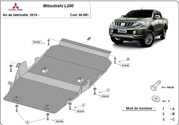 Skid plate for the protection of the: engine, gearbox, transfer case . The skid plate is new and fits perfectly for all versions of Mitsubishi L200 manufactured between 2015 and 2026. Made out of 2.5 mm thick Steel plate. Screws, nuts, clips, all fastening accessories are included. All skid plates are powder coated to prevent corrosion. The exterior of the skid plate is provided with Steel reinforcements, which increases the resistance to impact. |