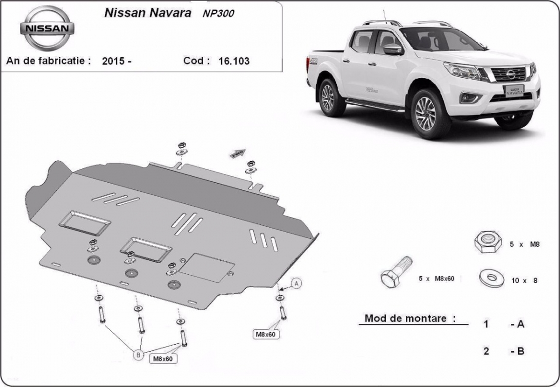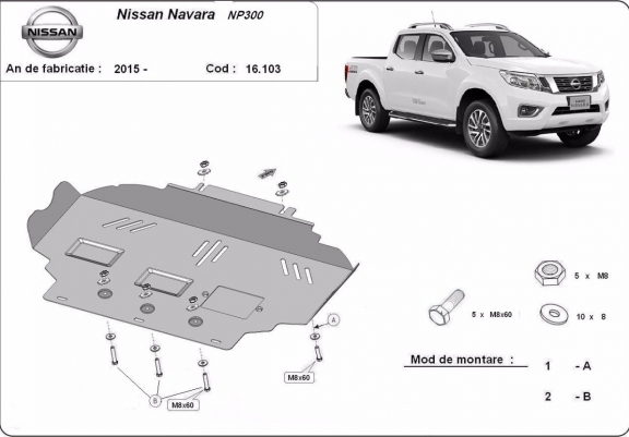 Skid plate for the protection of the: engine . The skid plate is new and fits perfectly for all versions of Nissan Navara NP300 manufactured between 2015 and 2021. It has an opening for the oil sump, so it's removal won't be necessary to change the oil. Made out of 2.5 mm thick Steel plate. Screws, nuts, clips, all fastening accessories are included. All skid plates are powder coated to prevent corrosion. The exterior of the skid plate is provided with Steel reinforcements, which increases the resistance to impact. |