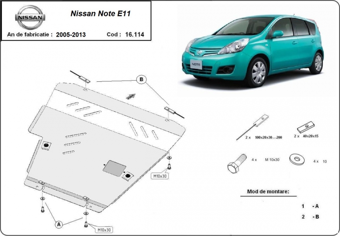 Skid plate for the protection of the: engine, gearbox . The skid plate is new and fits perfectly for all versions of Nissan Note manufactured between 2007 and 2013. It has an opening for the oil sump, so it's removal won't be necessary to change the oil. Made out of 2 mm thick Steel plate. Screws, nuts, clips, all fastening accessories are included. All skid plates are powder coated to prevent corrosion. The exterior of the skid plate is provided with Steel reinforcements, which increases the resistance to impact. |
