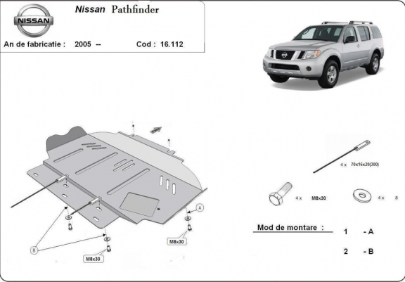 Skid plate for the protection of the: engine . The skid plate is new and fits perfectly for all versions of Nissan Pathfinder manufactured between 2005 and 2015. It has an opening for the oil sump, so it's removal won't be necessary to change the oil. Made out of 3 mm thick Steel plate. Screws, nuts, clips, all fastening accessories are included. All skid plates are powder coated to prevent corrosion. The exterior of the skid plate is provided with Steel reinforcements, which increases the resistance to impact. |