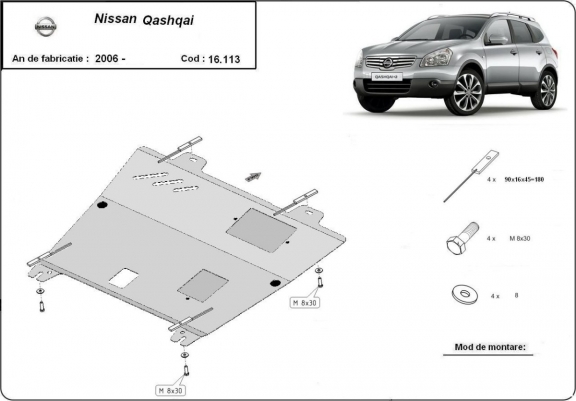 Skid plate for the protection of the: engine, gearbox . The skid plate is new and fits perfectly for the Nissan Qashqai, with the following engine/drive versions: 1.6, 2.0 - manufactured between 2006 and 2013. It has an opening for the oil sump, so it's removal won't be necessary to change the oil. Made out of 2 mm thick Steel plate. Screws, nuts, clips, all fastening accessories are included. All skid plates are powder coated to prevent corrosion. The exterior of the skid plate is provided with Steel reinforcements, which increases the resistance to impact. |