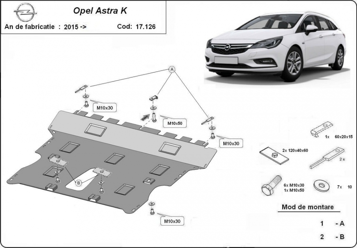 Skid plate for the protection of the: engine, gearbox, radiator, front bumper . The skid plate is new and fits perfectly for all versions of Opel Astra K manufactured between 2015 and 2022. Made out of 2 mm thick Steel plate. Screws, nuts, clips, all fastening accessories are included. All skid plates are powder coated to prevent corrosion. The exterior of the skid plate is provided with Steel reinforcements, which increases the resistance to impact. |