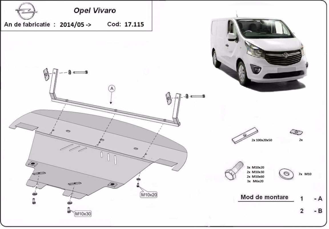 Skid plate for the protection of the: engine, gearbox, radiator, front bumper . The skid plate is new and fits perfectly for all versions of Opel Vivaro manufactured between 2014 and 2019. Made out of 2 mm thick Steel plate. Screws, nuts, clips, all fastening accessories are included. All skid plates are powder coated to prevent corrosion. The exterior of the skid plate is provided with Steel reinforcements, which increases the resistance to impact. |