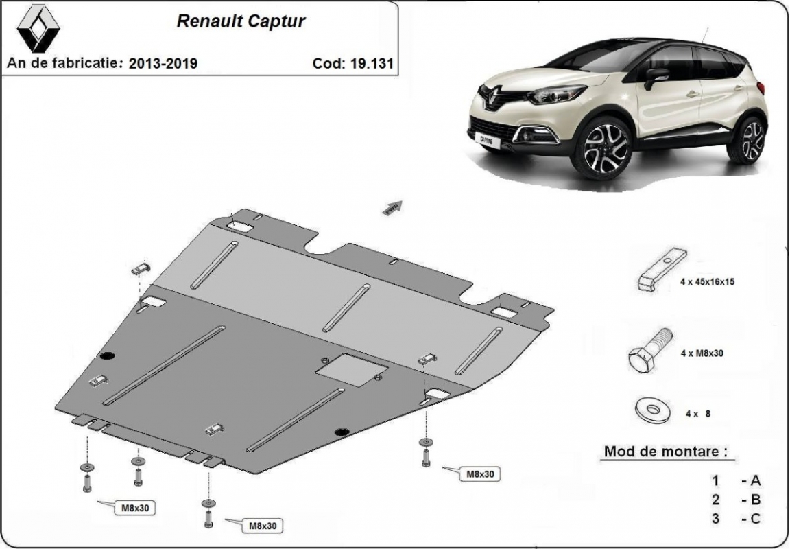 Skid plate for the protection of the: engine, gearbox . The skid plate is new and fits perfectly for all versions of Renault Captur manufactured between 2013 and 2019. It has an opening for the oil sump, so it's removal won't be necessary to change the oil. Made out of 2 mm thick Steel plate. Screws, nuts, clips, all fastening accessories are included. All skid plates are powder coated to prevent corrosion. The exterior of the skid plate is provided with Steel reinforcements, which increases the resistance to impact. |