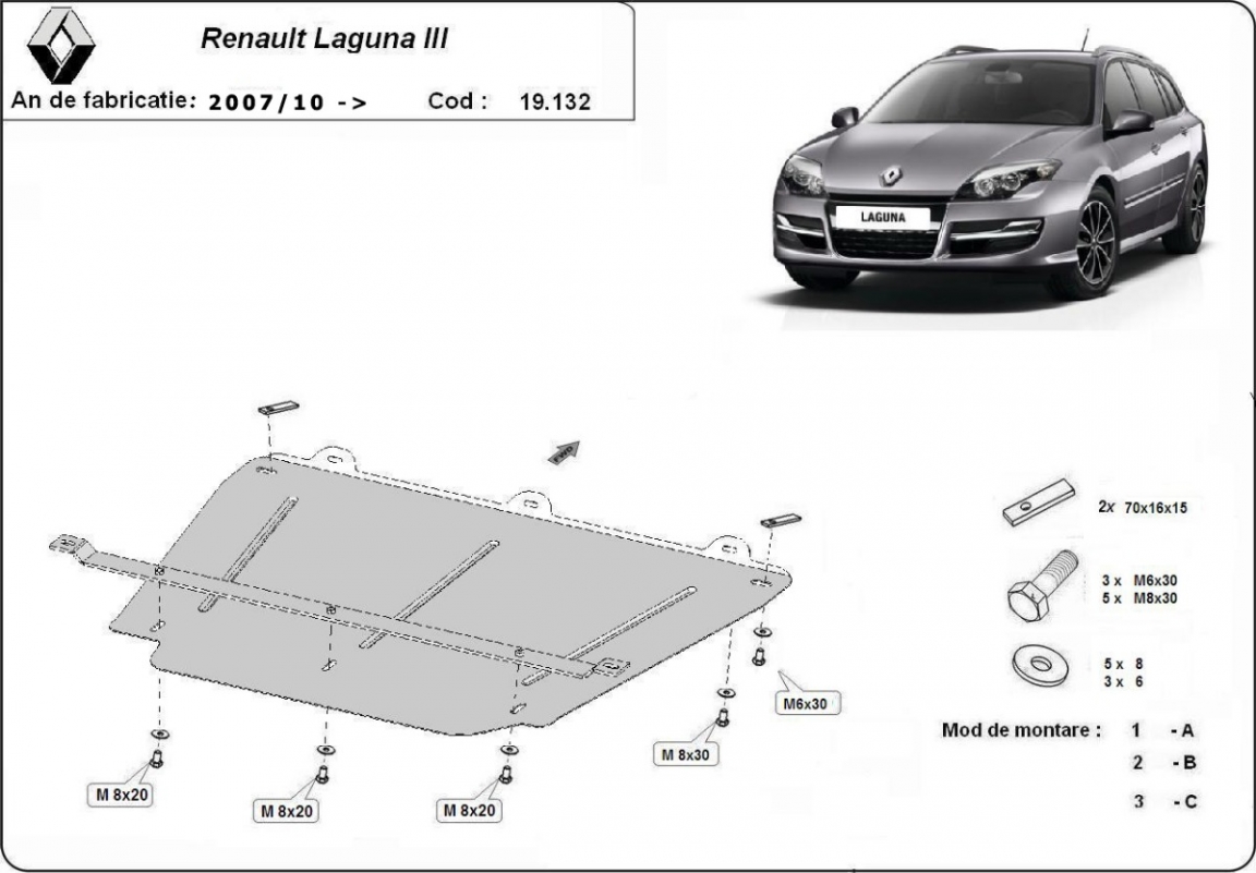 Skid plate for the protection of the: engine, gearbox . The skid plate is new and fits perfectly for all versions of Renault Laguna 3 manufactured between 2007 and 2015. Made out of 2 mm thick Steel plate. Screws, nuts, clips, all fastening accessories are included. All skid plates are powder coated to prevent corrosion. The exterior of the skid plate is provided with Steel reinforcements, which increases the resistance to impact. |