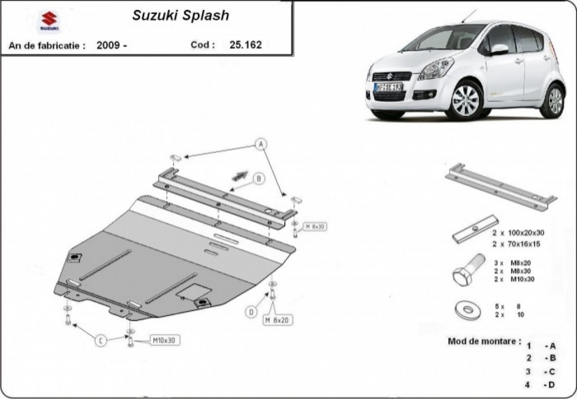 Skid plate for the protection of the: engine, gearbox . The skid plate is new and fits perfectly for all versions of Suzuki Splash an manufactured between 2009 and 2016. It has an opening for the oil sump, so it's removal won't be necessary to change the oil. Made out of 2 mm thick Steel plate. Screws, nuts, clips, all fastening accessories are included. All skid plates are powder coated to prevent corrosion. The exterior of the skid plate is provided with Steel reinforcements, which increases the resistance to impact. |