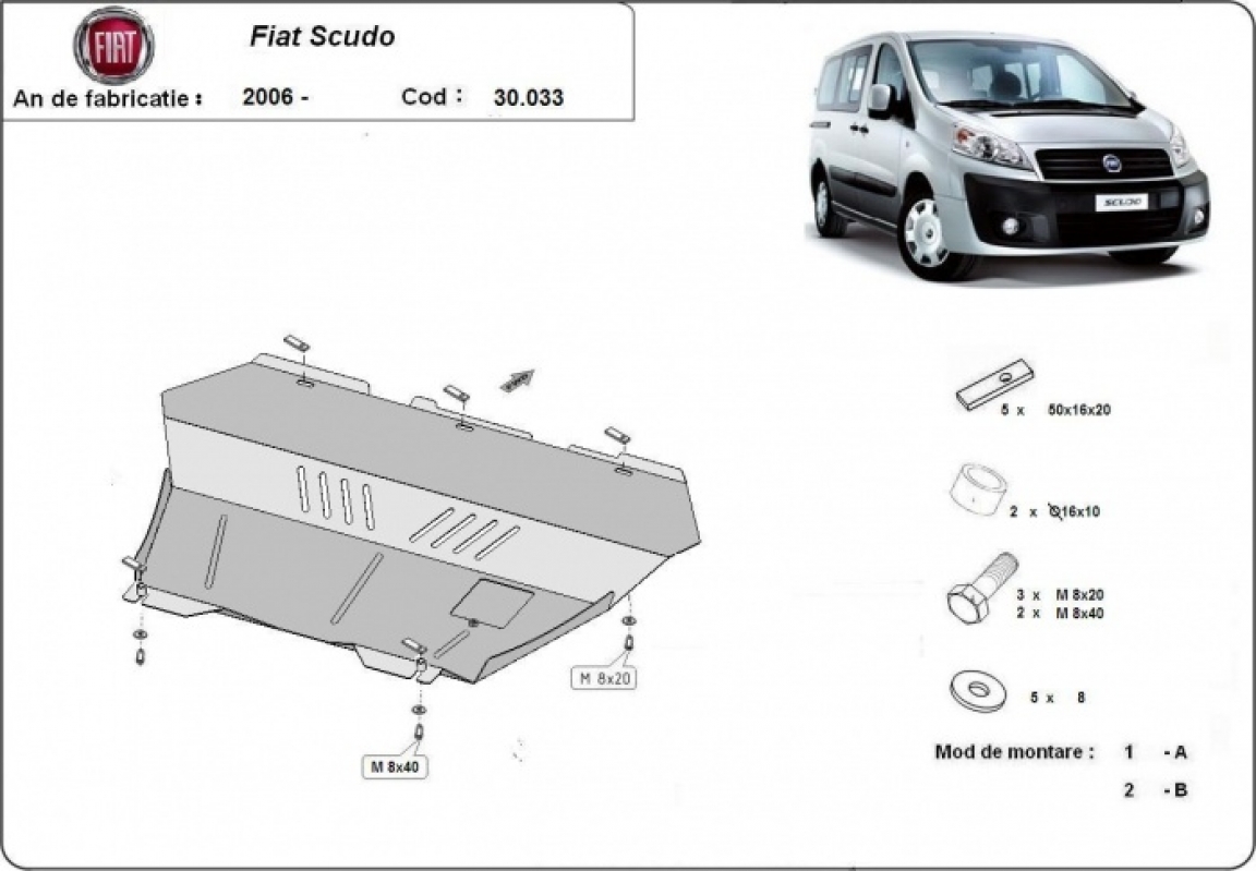 Skid plate for the protection of the: engine, gearbox, radiator . The skid plate is new and fits perfectly for all versions of Fiat Scudo manufactured between 2006 and 2016. It has an opening for the oil sump, so it's removal won't be necessary to change the oil. Made out of 2 mm thick Steel plate. Screws, nuts, clips, all fastening accessories are included. All skid plates are powder coated to prevent corrosion. The exterior of the skid plate is provided with Steel reinforcements, which increases the resistance to impact. |