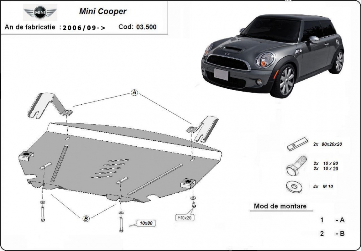 Skid plate for the protection of the: engine, gearbox . The skid plate is new and fits perfectly for all versions of Mini Cooper R56 manufactured between 2006 and 2014. Made out of 2 mm thick Steel plate. Screws, nuts, clips, all fastening accessories are included. All skid plates are powder coated to prevent corrosion. The exterior of the skid plate is provided with Steel reinforcements, which increases the resistance to impact. |