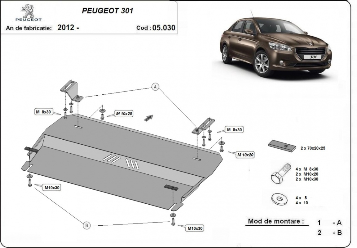 Skid plate for the protection of the: engine, gearbox . The skid plate is new and fits perfectly for all versions of Peugeot 301 manufactured between 2012 and 2026. Made out of 2 mm thick Steel plate. Screws, nuts, clips, all fastening accessories are included. All skid plates are powder coated to prevent corrosion. The exterior of the skid plate is provided with Steel reinforcements, which increases the resistance to impact. |