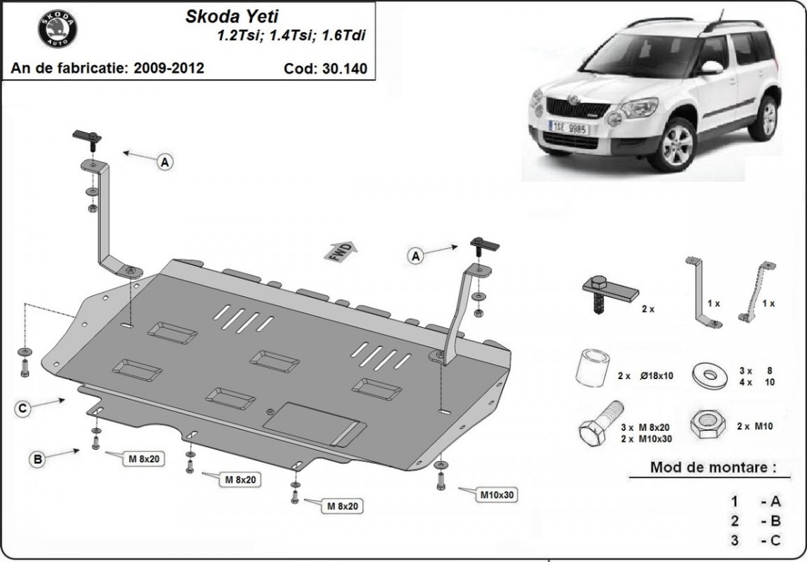 Skid plate for the protection of the: engine, gearbox, radiator . The skid plate is new and fits perfectly for the Skoda Yeti, with the following engine/drive versions: 1.2,1.4,TSI, 1.8 , 1.6TDI, 2.0TDI,1.8TSI - manufactured between 2009 and 2012. It has an opening for the oil sump, so it's removal won't be necessary to change the oil. Made out of 2 mm thick Steel plate. Screws, nuts, clips, all fastening accessories are included. All skid plates are powder coated to prevent corrosion. The exterior of the skid plate is provided with Steel reinforcements, which increases the resistance to impact. |