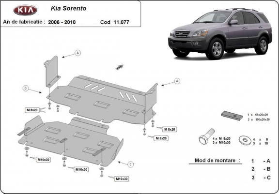 Skid plate for the protection of the: engine, radiator . The skid plate is new and fits perfectly for all versions of Kia Sorento manufactured between 2006 and 2009. Made out of 2 mm thick Steel plate. Screws, nuts, clips, all fastening accessories are included. All skid plates are powder coated to prevent corrosion. The exterior of the skid plate is provided with Steel reinforcements, which increases the resistance to impact. |
