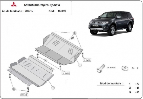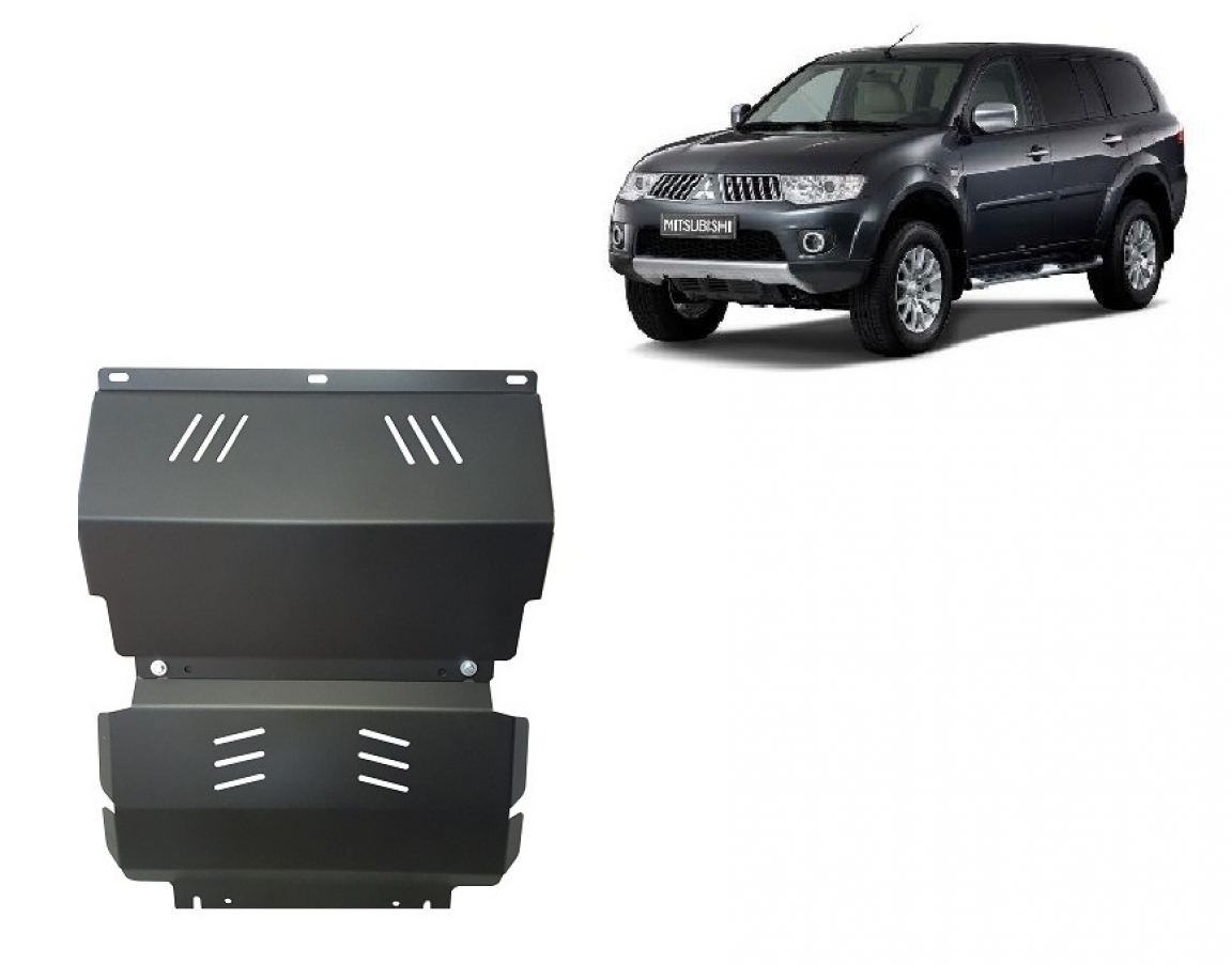 Skid plate for the protection of the: engine, radiator . The skid plate is new and fits perfectly for all versions of Mitsubishi Pajero Sport 2 manufactured between 2008 and 2016. Made out of 3 mm thick Steel plate. Screws, nuts, clips, all fastening accessories are included. All skid plates are powder coated to prevent corrosion. The exterior of the skid plate is provided with Steel reinforcements, which increases the resistance to impact. |