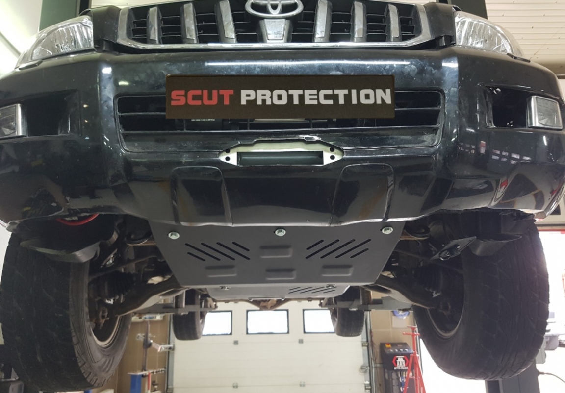 Skid plate for the protection of the: engine, radiator, front bumper . The skid plate is new and fits perfectly for all versions of Toyota 4Runner manufactured between 2002 and 2009. Made out of 2,5 mm thick Steel plate. Screws, nuts, clips, all fastening accessories are included. All skid plates are powder coated to prevent corrosion. The exterior of the skid plate is provided with Steel reinforcements, which increases the resistance to impact. |