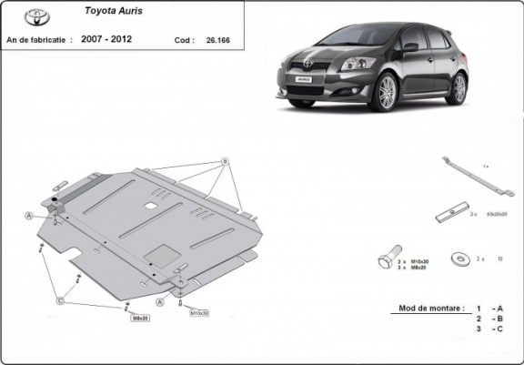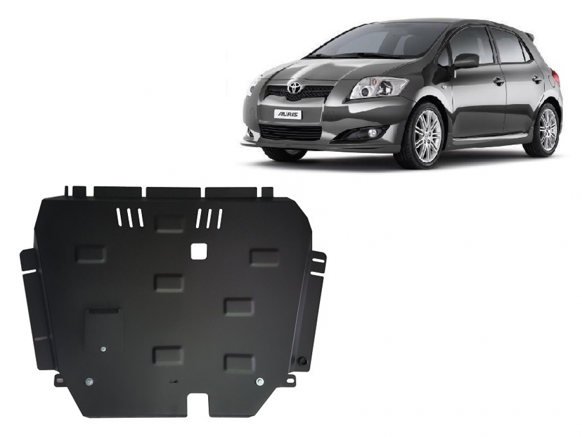 Skid plate for the protection of the: engine, gearbox, radiator . The skid plate is new and fits perfectly for all versions of Toyota Auris manufactured between 2007 and 2012. It has an opening for the oil sump, so it's removal won't be necessary to change the oil. Made out of 2 mm thick Steel plate. Screws, nuts, clips, all fastening accessories are included. All skid plates are powder coated to prevent corrosion. The exterior of the skid plate is provided with Steel reinforcements, which increases the resistance to impact. |